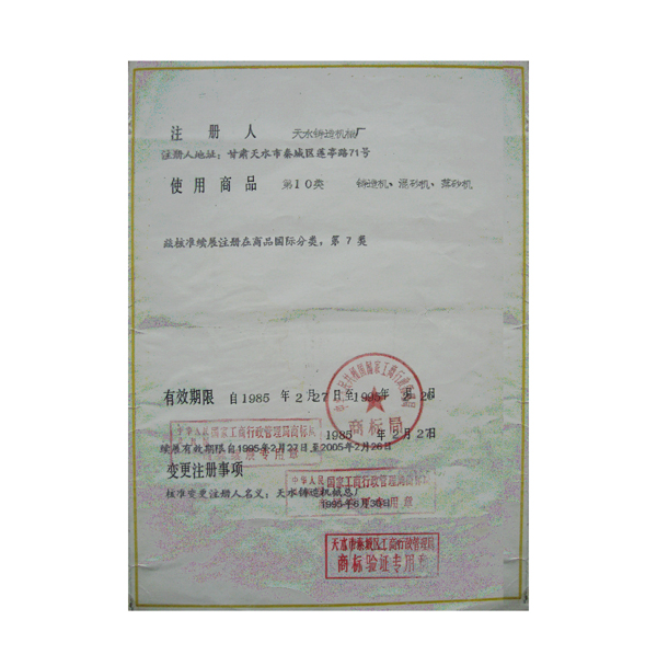 商標(biāo)注冊(cè):1985年2月27日由《中華人民共和國(guó)國(guó)家工商行政管理局商標(biāo)局》批準(zhǔn)為注冊(cè)商標(biāo),核定使用商標(biāo)第10類(國(guó)際分類第7類)注冊(cè)號(hào)220927 “TSZ” 牌商標(biāo)注冊(cè)證。
